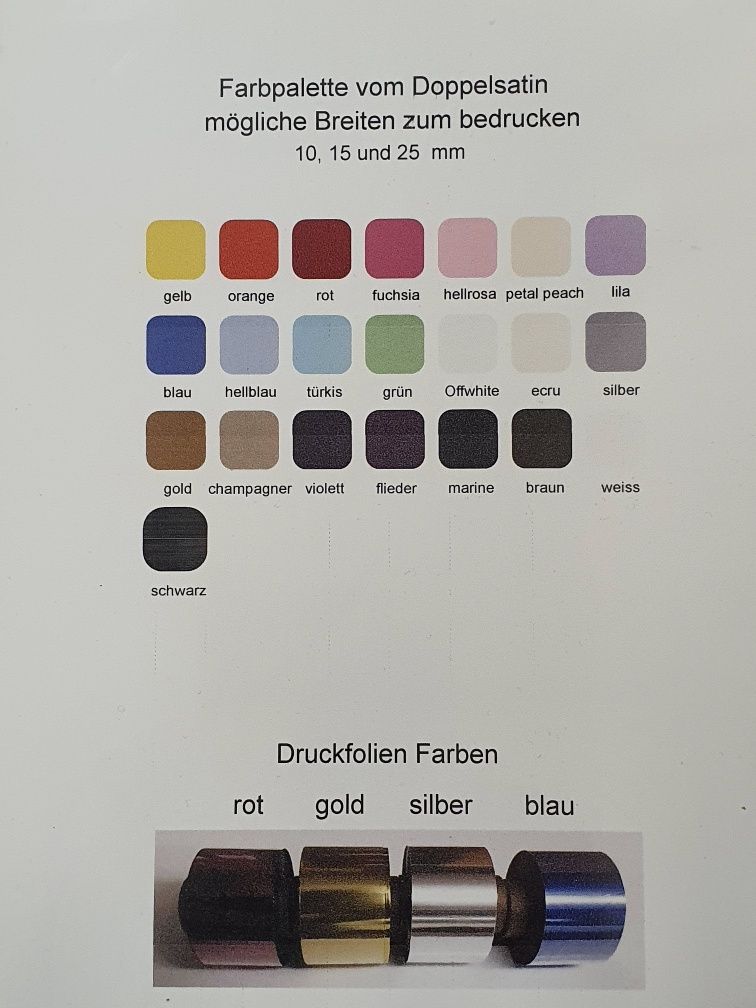 Mögliche Farben und Breiten von unserem Qualitativ hochstehendem Doppelsatinband.